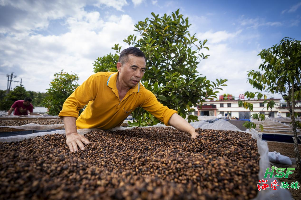 采收后的海垦母山咖啡浆果平铺在晾台上,利用日光暴晒,将咖啡果脱去水分。