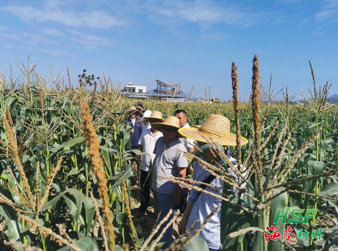 科研人员在海南南繁种业集团的试验田察看玉米植株情况。